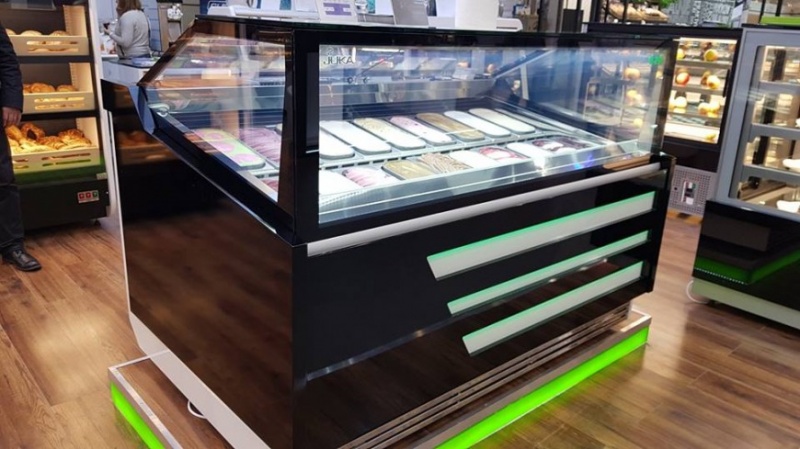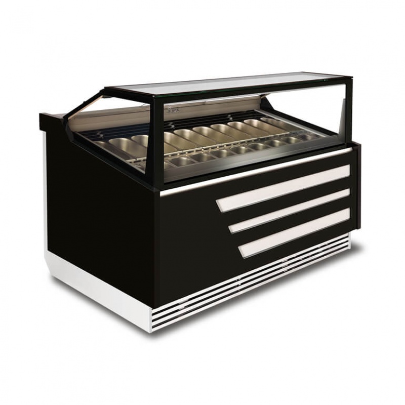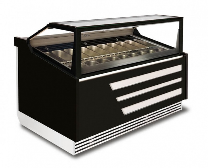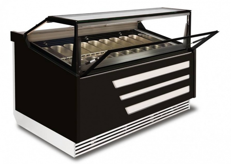 Vitrina de înghețată Paradiso este un expozitor de înghețată modern și de încredere realizat din tablă acoperită prin vopsire cu pulbere de înaltă calitate. Paradiso este un echipament cu un design unic proiectat special pentru cei mai pretentiosi proprietari de gelaterii,cofetarii, cafenele, patiserii, brutării etc. Acest model se caracterizează printr-un design unic, modern, precum și o eficiență ridicată datorită utilizării răcirii forțate, produsele stocate în dispozitiv sunt răcite perfect, iar iluminatul interior si exterior cu LED-uri, ofera o prezentare fantastica in afisarea perfecta a înghețatei expuse..Instalatia frigorifica functioneaza cu agent frigorific ecologic R290 cu functii total automatizate.