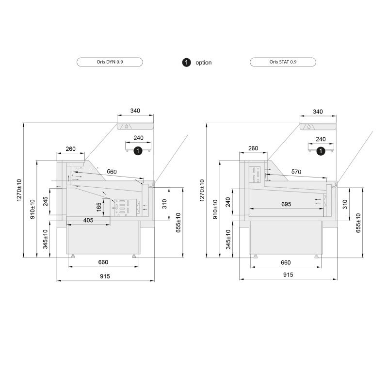 Vitrina frigorifica ORIS 0.9 este un aparat dotat cu agregat intern si racire dinamica, care asigura o racire rapida si uniforma la temperaturi intre +1…+10*C .In plus, aparatul are blat de lucru din otel inoxidabil, display generos cu o adancime de 84 cm cu polite din Inox , spatiu de depozitare voluminoasa din Inox cu iluminare interioara LED special carne. Dispune de , programator digital cu functia de decongelare automata.Freon ecologic R290.Geam glisant spate din plexiglass.Disponibil si in varianta pentru agregat extern. Multiplexabil. Se pot configura in linie. Produs in doua versiuni ...DYN -Racire ventilata ...STAT -Racire Statica .Disponibil atat versiunea de colt interior sau exterior cat si versiunea de self service.