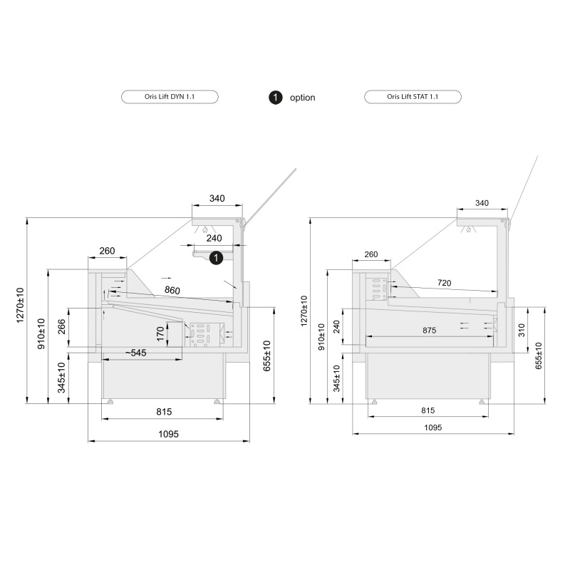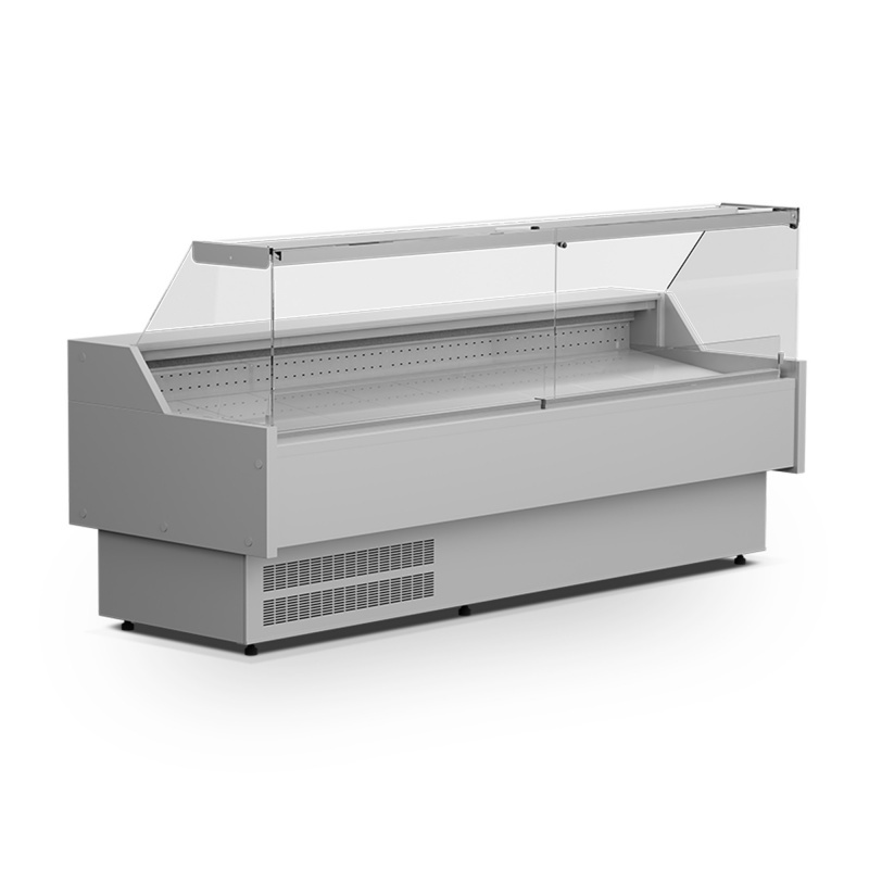Vitrina frigorifica ORIS 1.1 este un aparat dotat cu agregat intern si racire dinamica, care asigura o racire rapida si uniforma la temperaturi intre +1…+10*C .In plus, aparatul are blat de lucru din otel inoxidabil, display generos cu o adancime de 84 cm cu polite din Inox , spatiu de depozitare voluminoasa din Inox cu iluminare interioara LED special carne. Dispune de geam frontal cu ridicare prin sistem telescopic cu autosustinere, programator digital cu functia de decongelare automata.Freon ecologic R290.Geam glisant spate din plexiglass.Disponibil si in varianta pentru agregat extern. Multiplexabil. Se pot configura in linie. Produs in doua versiuni ...DYN -Racire ventilata ...STAT -Racire Statica .Disponibil atat versiunea de colt interior sau exterior cat si versiunea de self service.