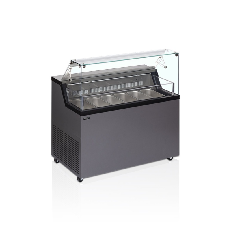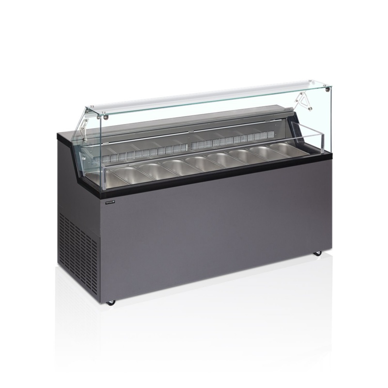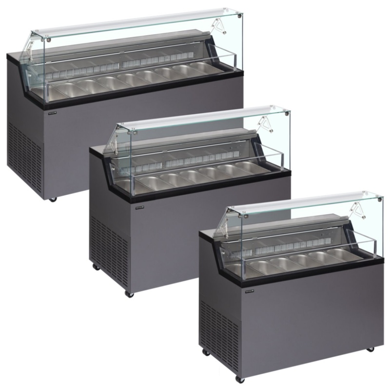 Vitrina frigorifica pentru inghetata MIRELLA este un model care intruneste atat un desygn special cat si posibilitatea de expunere si depozitare in conditii optime al produselor oferite catre vanzare. Cu Racire Statica cu un spatiu de depozitare generos sub cosuri ofera atat o suprafata impresionata de expunere cat si un depozit voluminos pentru depozitare . Iluminat interior prin LED ,Comanda digitala cu functii automatizate inclusiv decongelare automata ... Roti pentru manevrare usoara .Potrivit pentru cuve Napoli ...Temperatura realizata -20...-5*C .Interior inox / exterior culoare grii anthracite RAL7016.